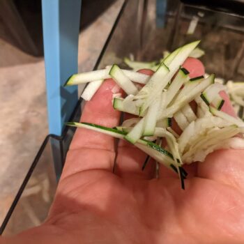 The slicer works great with vegetables like cucumbers and peppers. It struggled with a soft block of cheese, so I used a different grater for that.