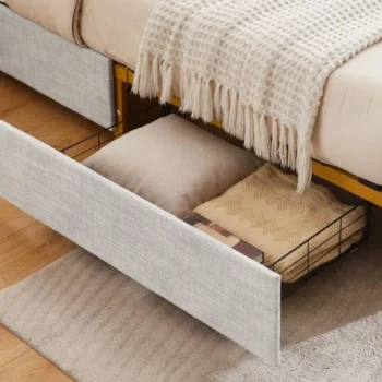This bed frame is exactly as advertised, sturdy, and comfortable for placing a mattress. I adore the drawers for added storage, although I wish they were crafted with a smoother mechanism. Fortunately, having carpet muffles any noise they make while rolling in and out.